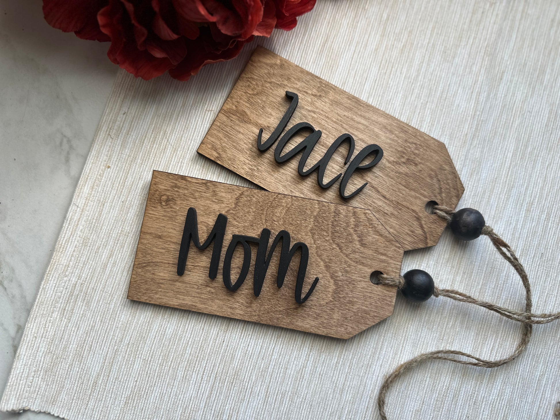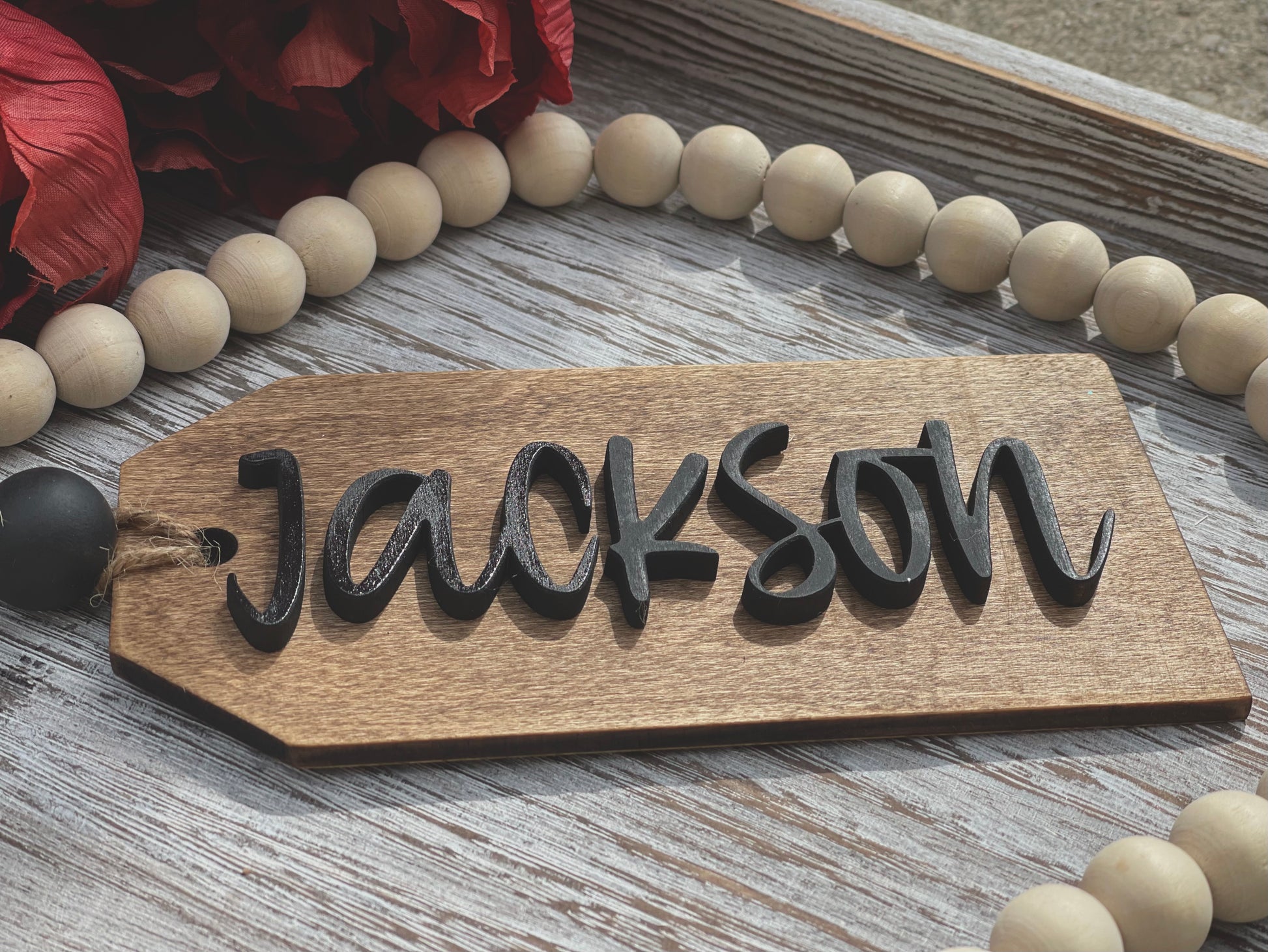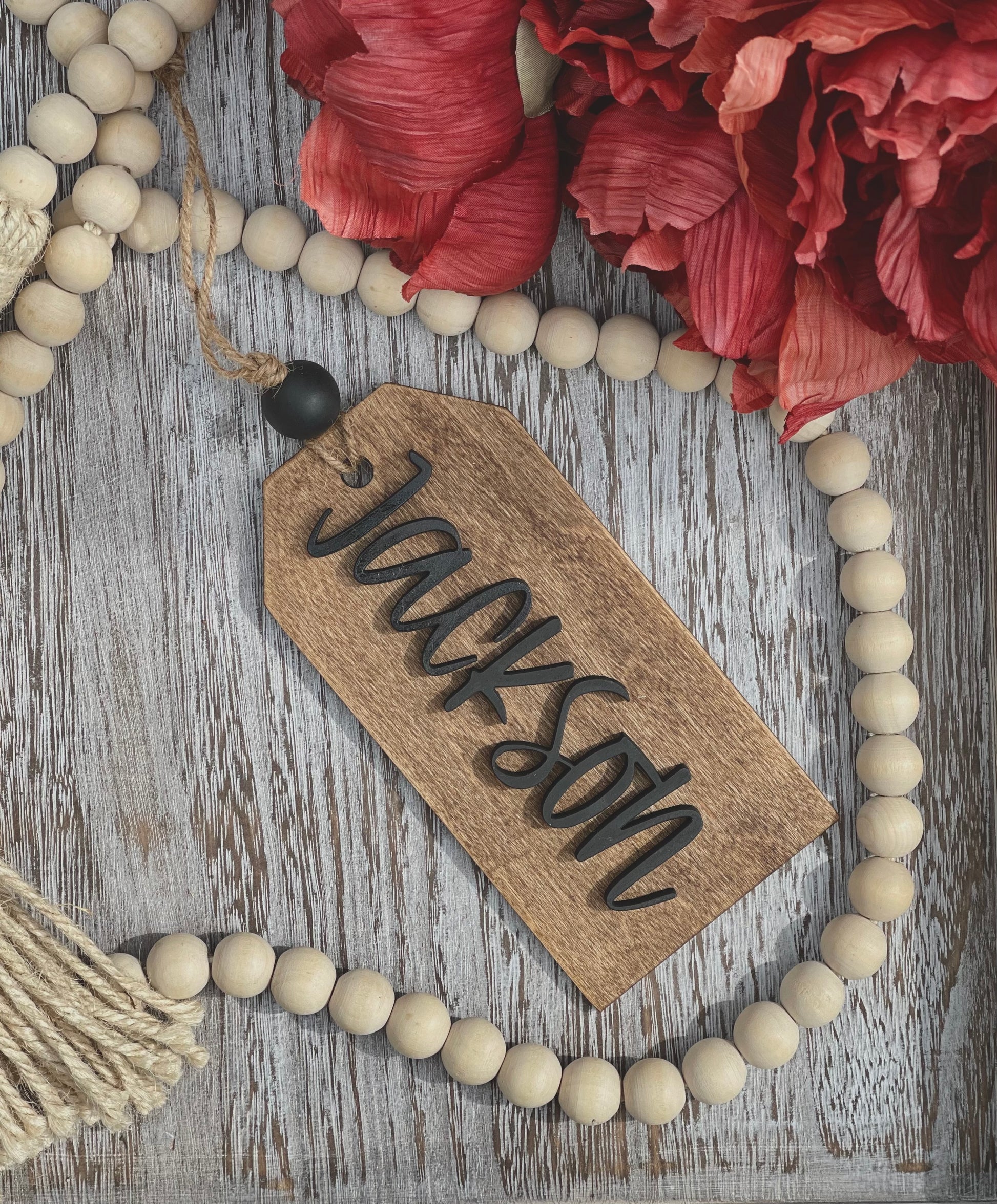 A 3D stocking tag made from 1/4”maple ply and stained.