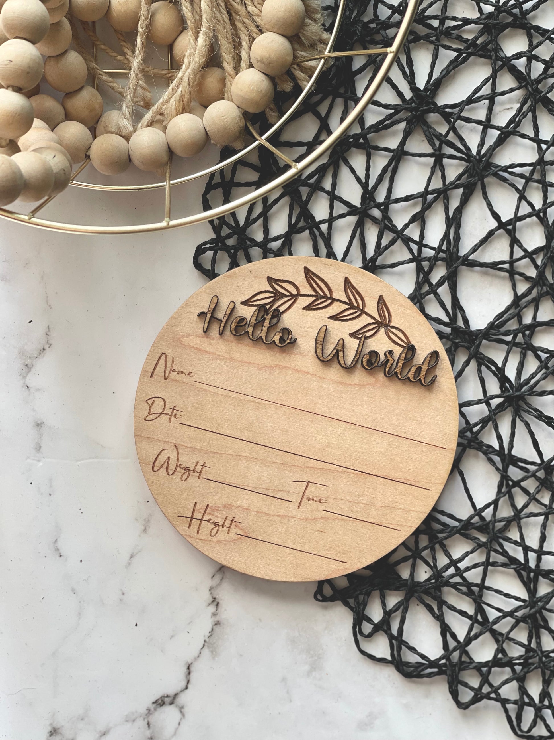 Fill in the blank style baby announcement made of 1/4” maple ply. Approximately 5” across. The edges are sanded smooth to keep baby safe.