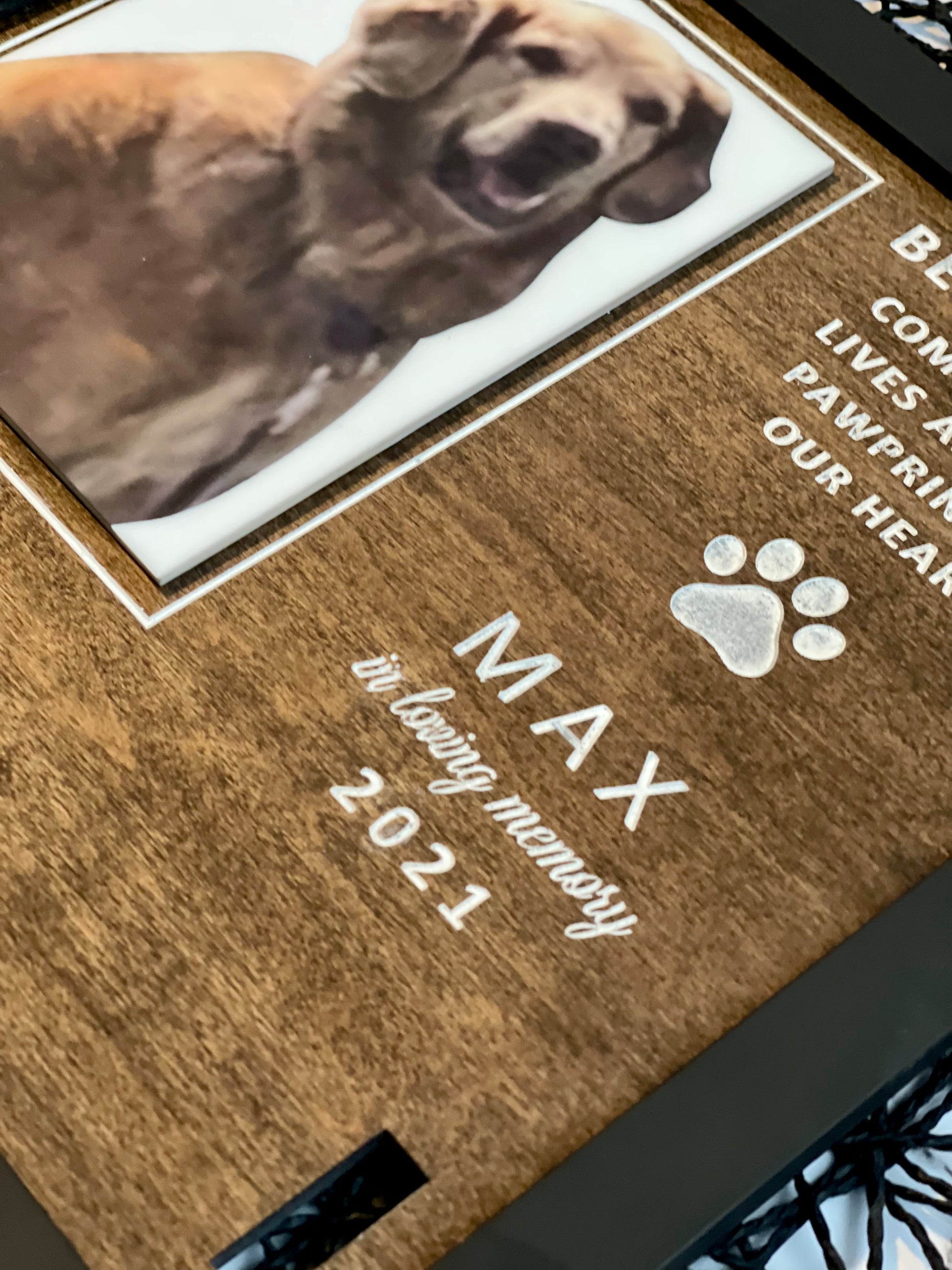 Provide your pets name, years of life and a clear photo and we can create your unique memorial sign. This sign features holes to hold your pets collar. The distance between the holes can be adjusted for smaller pets. Please note: we can not enhance the quality of your photo but we can remove the background of your image.